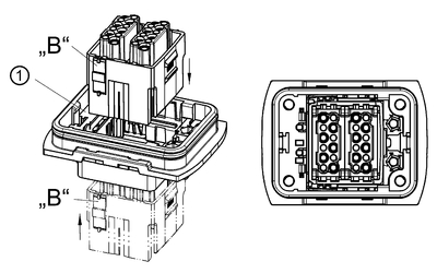 Han-Yellock® adapter frame. Han-Modular® series interfaces can be established using the Han-Yellock® adapter frame. The connection is based on a male/female contact arrangement. Inserting the adapter frame in the housing: The adapter frame can be snapped into the housing, bulkhead mounting, on the termination side and the mating side (refer to the illustration). The lateral plastic tabs („B“) are pressed into the metal clamps on the housing. The adapter frame then snaps in with a distinctly audible click.