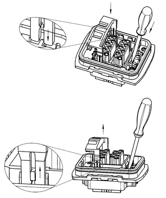 ? metal clampRemoval of the adapter frame:. The removal tool part no. 11 99 000 0001 is required for disassembly. (see chapter 90) The removal tool is inserted into the metal clamp and pressed down as shown in the following illustration. A screwdriver need also be placed into the notch in the housing. The removal tool should then be pulled outwards to remove the adapter frame from the housing. The removal can be made from the termination side as well as from the mating side. The process is identical for both housings, bulkhead mounting, and carrier hoods.